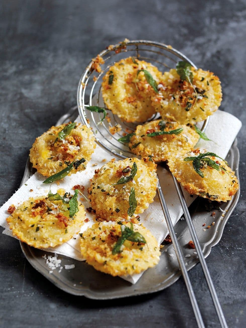 Heat oil in a heavy-based saucepan until hot and fry the ravioli in batches for 3-5 minutes until golden. Remove from the oil and drain on kitchen paper.