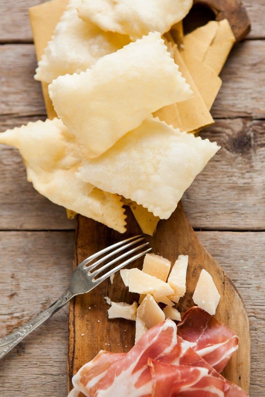 Roll out the dough with a pasta machine (to a thickness of about 3 mm) and cut into rectangles. Heat the oil in a narrow and tall pot and fry for about 2 minutes, using a skimmer to keep the torta fritta pieces completely immersed in the oil.